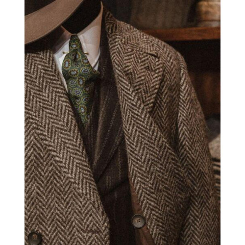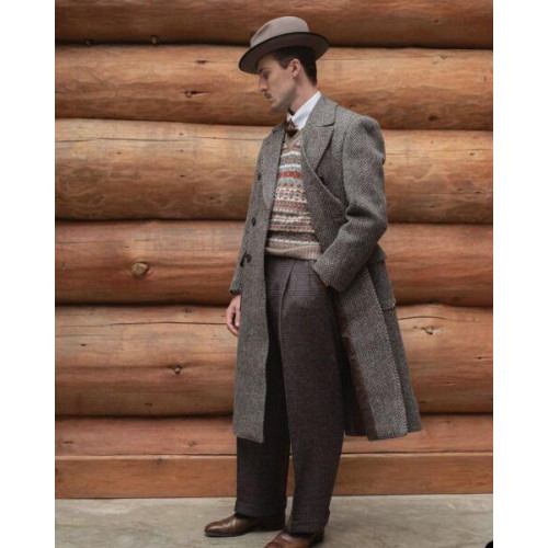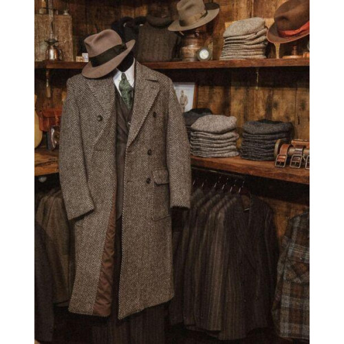 Herringbone Wool Blend Coat Men Long Overcoat Double Breasted Winter Business