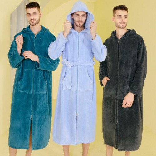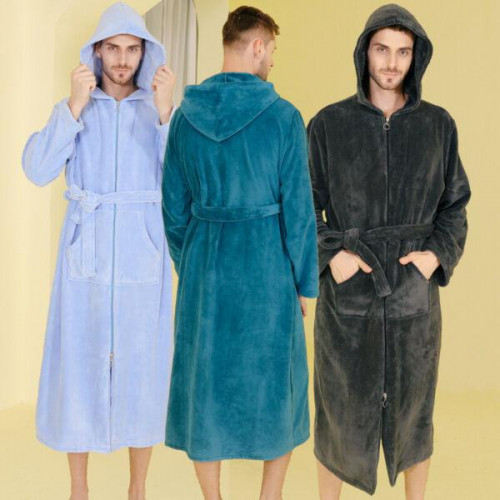 Men Coral Fleece Pajama Robe Hooded Pocket Double Zipper Sleepwear Bathrobe